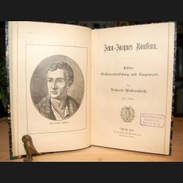 Jean-Jacques Rousseau. Leben, Geistesentwickelung und Hauptwerke. Leipzig: Renger, 1889. 176 Seiten mit einer Abbildung als Frontispiz. Fraktursatz. Unbeschrifteter privater Halbleinenband der Zeit. 366 g