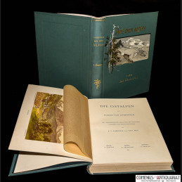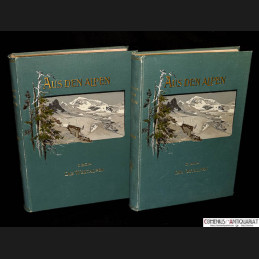 Aus den Alpen. Prag, Wien / Leipzig: Tempsky / Freytag, 1896. 2 Bände, XII, 486 und XII, 511 Seiten mit Abbildungen und Register. Leinen mit Goldprägung, Deckelillustration, Lesebändchen und Kopfgoldschnitt. 4to. 277 x 198 mm.