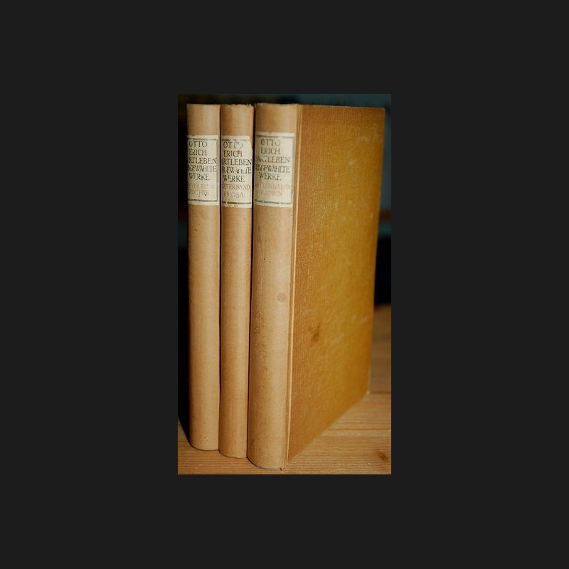 Hartleben, Otto Erich, Ausgewählte Werke in drei Bänden. Berlin: S. Fischer, 1920. 3 Bände. Pappbände (gebunden) mit Farbkopfschnitt. Kleinoktav. 874 g* Auswahl und Einleitung von Franz Ferdinand Heitmueller. 1. Gedichte. 231 Seiten mit einer Abbildung; 2. Prosa. 223 S.; 3. Dramen. 307 Seiten. - Stark gebräunt. Bestell-Nr.127525Hartleben | Werkausgaben | Deutsche Literatur
