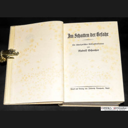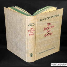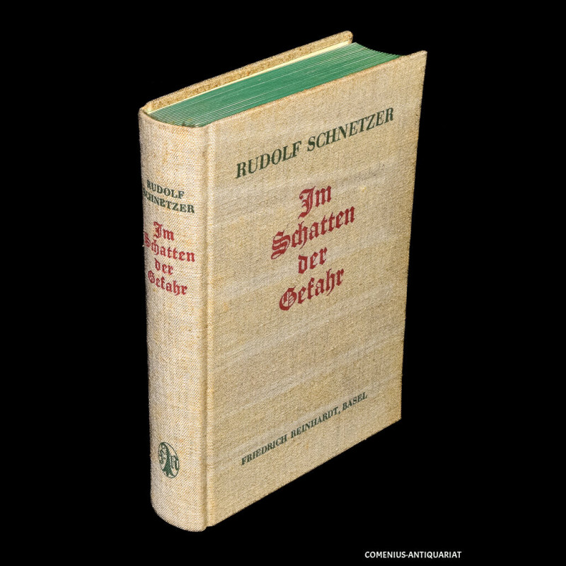 Im Schatten der Gefahr. Ein schweizerischer Gebirgsdorfroman. Basel: Reinhardt, [1936]. 325 Seiten, Fraktursatz. Leinen mit Farbkopfschnitt. 192 x 135 mm. 436 g