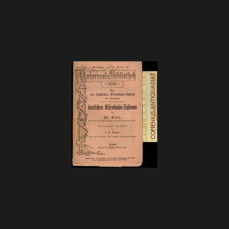 List, Friedrich, Über ein sächsisches Eisenbahn-System als Grundlage eines allgemeinen deutschen Eisenbahn-Systems. Leipzig: Reclam, [1897]. 77 Seiten mit einem Faltplan. Fraktursatz. Broschiert. Kleinoktav. 41 g* Neu herausgegeben und eingeleitet von L. O. Brandt. - Leicht gebräunt. Bestell-Nr.125650List | 1850-1899 | Eisenbahn