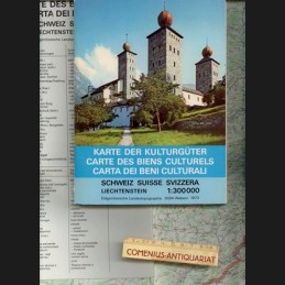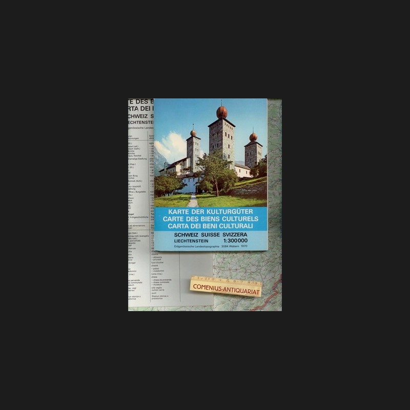Schweiz, Liechtenstein = Carte des biens culturels = Carta dei beni culturali. Wabern: Eidgenössische Landestopographie, 1970. 48 Seiten Detailkarten und Faltkarte 1:300000. Kartoniert (Klappenbroschur), Karte 118 x 78 cm. 217 g