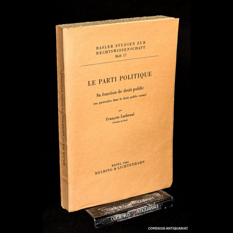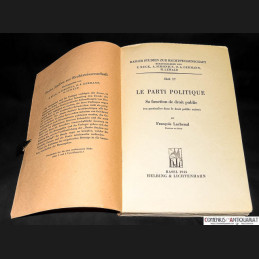Le parti politique, sa fonction de droit public (en particulier dans le droit public suisse). Basel: Helbing und Lichtenhahn, 1944. 292 Seiten mit Literaturverzeichnis. Broschiert. Grossoktav. 233 x 155 mm.