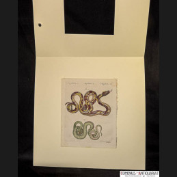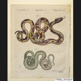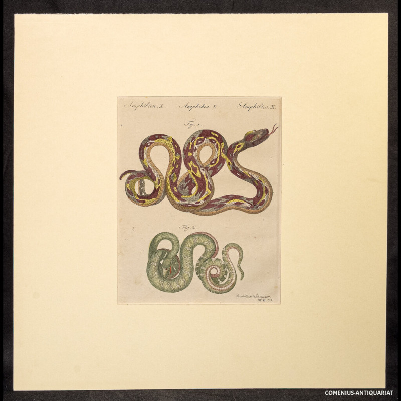 Amphibien X [Tafel X. Die Abgottschlange und der Hundskopf (Boa constrictor & Corallus caninus)]. [Wien: Verlag Anton Pichler], [ca. 1810]. Handkolorierter Kupferstich. Blattgrösse 251 x 203 mm. Plattengrösse 224 x 175 mm. In Passepartout aus gefaltetem Halbkarton. 410 x 406 mm.