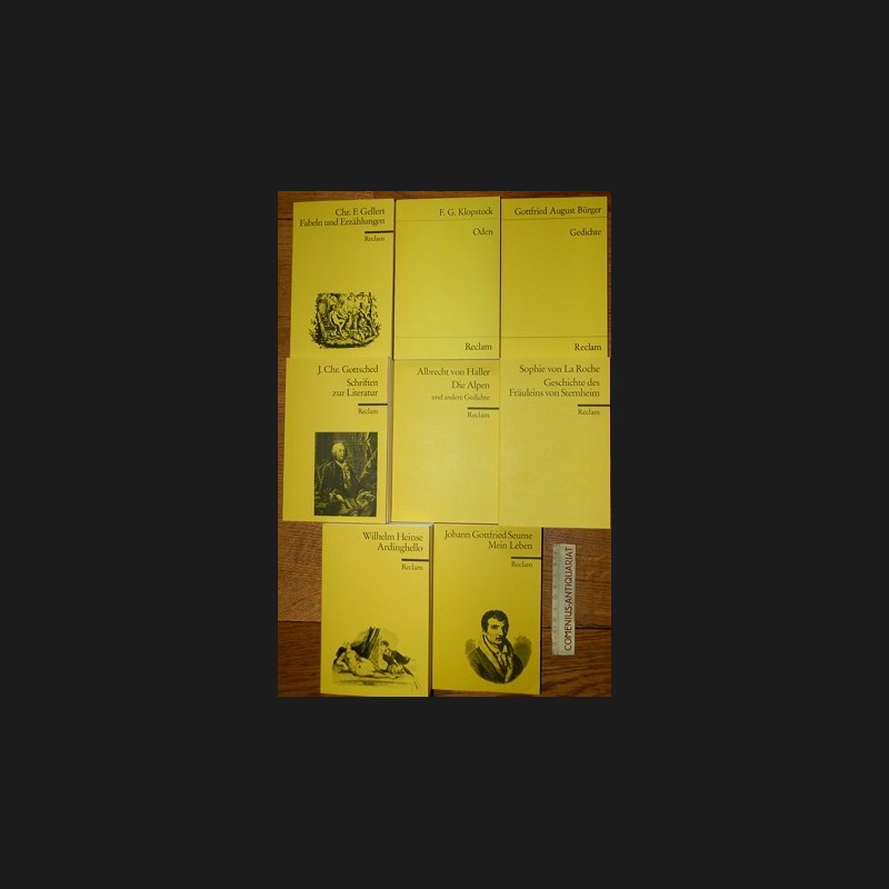 * Reclams Universal-Bibliothek RUB. - Wilhelm Heinse: Ardinghello. RUB 9792; Seume: Mein Leben. RUB 1060; Sophie von La Roche: Geschichte des Fräuleins von Sternheim. RUB 7934; Albrecht von Haller: Die Alpen. RUB 8963; J.Chr. Gottsched: Schriften zu Literatur. RUB 9361; G.A. Bürger: Gedichte. RUB 227; F.G. Klopstock: Oden. RUB 1391; Gellert: Fabeln und Erzählungen. RUB 161