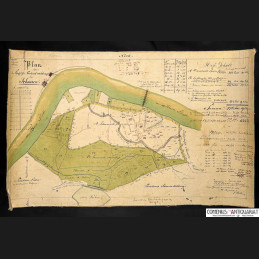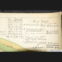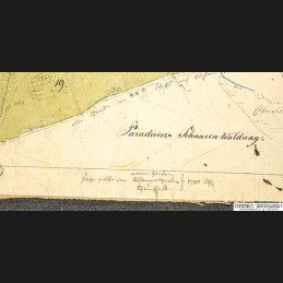 https://comenius-antiquariat.ch/buch/161692.html Forstkatasterplan des Kantons Schaffhausen. Zeigt die kantonale Waldung «Schaaren» am Rhein mit Parzellierung, Flächenberechnungen (Meß-Gehalt), Wegen, Wiesen («Kleewiese», «Paradieser Felder»), oberem Weiher sowie angrenzendem Rheinlauf. Maßstab 1:4000. Tusche und Aquarell auf Papier, auf Leinen gezogen. 309 × 505 mm.