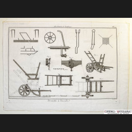 * Kupferstich-Tafel aus der Encyclopédie ou Dictionnaire raisonné des sciences, des arts et des métiers. Zeigt technische Darstellungen einer Kippschubkarre in mehreren Ansichten und Einzelteilen (7 Figuren). Oben rechts Plattennummer Pl. 42, unten rechts signiert «Scattaglia dir.» - Der Passepartout aus einem gefalteten Halbkarton hat starke Knitterpuren. Die Tafel war vermutlich ursprünglich gefaltet, die vertikalen Falze sind sichtbar.